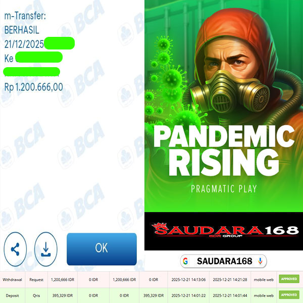 SAUDARA168 Bukti Kemenangan Slot Di Game PANDEMIC RISING Rp.1.200.666.,- Lunas.