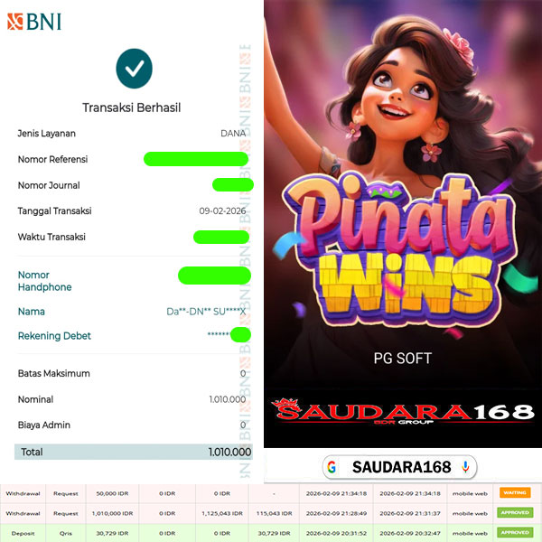 Selamat kepada User id : Percxxxx Telah berhasil mendapatkan kemenangan besar pada permainan SLOT PINATA WINS kemenangan Sebesar Rp.1.060.000, Setelah mengisi formulir withdraw dengan kurung waktu hanya 5 – 10 menit pihak Saudara168 sudah melakukan transfer kepada pemilik User id dan dana sudah dapat di cairkan oleh pemenang. Bukti pembayaran yang kami berikan merupakan bukti pembayaran yang SAH / VALID yang langsung di dapatkan melalui tanda transfer transaksi dari Bank yang di tuju.