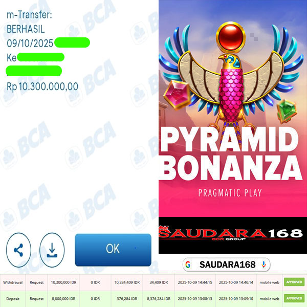 Selamat kepada User id : Sandxxxx Telah berhasil mendapatkan kemenangan besar pada permainan SLOT PYRAMID BONANZA kemenangan Sebesar Rp.10.300.000, Setelah mengisi formulir withdraw dengan kurung waktu hanya 5 – 10 menit pihak Saudara168 sudah melakukan transfer kepada pemilik User id dan dana sudah dapat di cairkan oleh pemenang. Bukti pembayaran yang kami berikan merupakan bukti pembayaran yang SAH / VALID yang langsung di dapatkan melalui tanda transfer transaksi dari Bank yang di tuju.