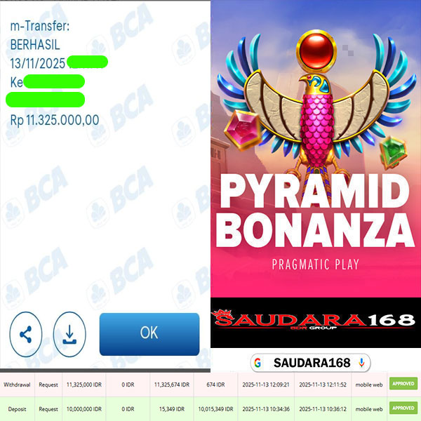 Selamat kepada User id : Sandxxxx Telah berhasil mendapatkan kemenangan besar pada permainan SLOT PYRAMID BONANZA kemenangan Sebesar Rp.11.325.000, Setelah mengisi formulir withdraw dengan kurung waktu hanya 5 – 10 menit pihak Saudara168 sudah melakukan transfer kepada pemilik User id dan dana sudah dapat di cairkan oleh pemenang. Bukti pembayaran yang kami berikan merupakan bukti pembayaran yang SAH / VALID yang langsung di dapatkan melalui tanda transfer transaksi dari Bank yang di tuju.