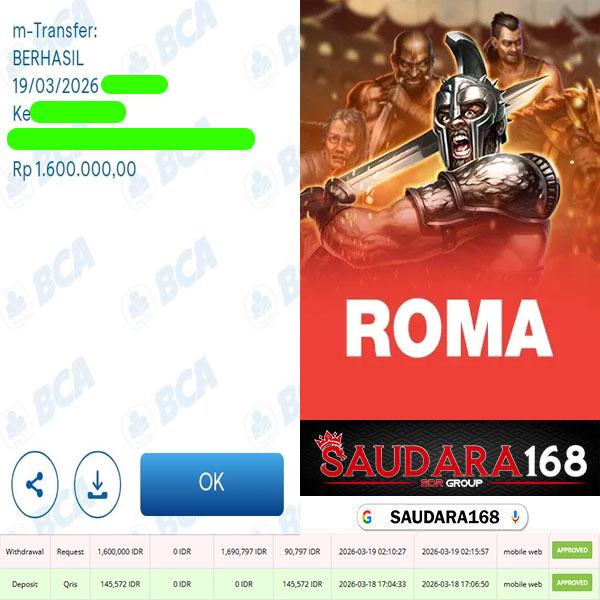 Selamat kepada User id : Wiroxxxx Telah berhasil mendapatkan kemenangan besar pada permainan SLOT ROMA kemenangan Sebesar Rp.1.600.000, Setelah mengisi formulir withdraw dengan kurung waktu hanya 5 – 10 menit pihak Saudara168 sudah melakukan transfer kepada pemilik User id dan dana sudah dapat di cairkan oleh pemenang. Bukti pembayaran yang kami berikan merupakan bukti pembayaran yang SAH / VALID yang langsung di dapatkan melalui tanda transfer transaksi dari Bank yang di tuju.