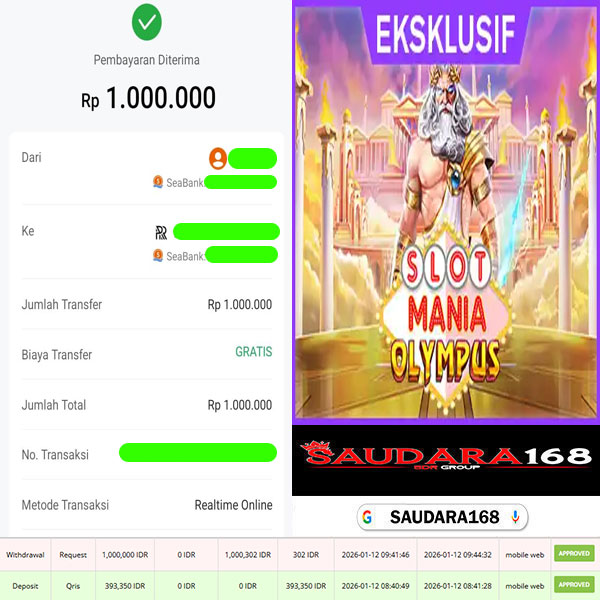 Selamat kepada User id : Examxxxx Telah berhasil mendapatkan kemenangan besar pada permainan SLOT SLOT MANIA OLYMPUS kemenangan Sebesar Rp.1.000.000, Setelah mengisi formulir withdraw dengan kurung waktu hanya 5 – 10 menit pihak Saudara168 sudah melakukan transfer kepada pemilik User id dan dana sudah dapat di cairkan oleh pemenang. Bukti pembayaran yang kami berikan merupakan bukti pembayaran yang SAH / VALID yang langsung di dapatkan melalui tanda transfer transaksi dari Bank yang di tuju.