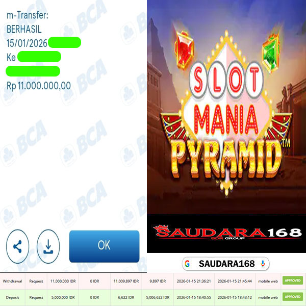 SAUDARA168 Bukti Kemenangan Slot Di Game SLOT MANIA PYRAMID Rp.11.000.000.,- Lunas.