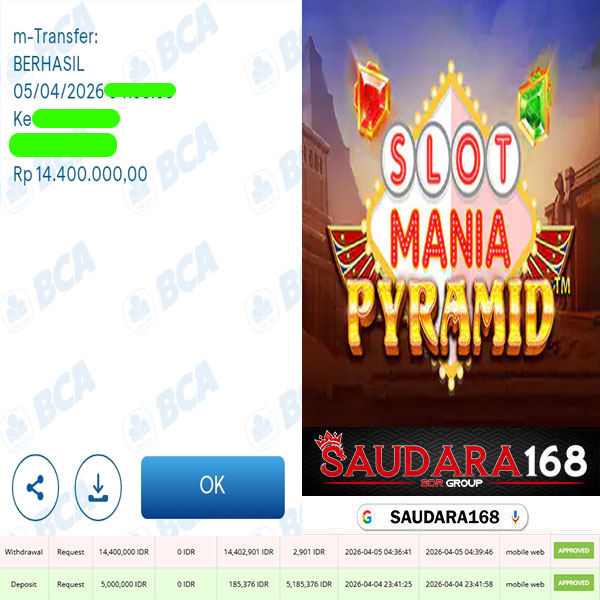 Selamat kepada User id : Sandxxxx Telah berhasil mendapatkan kemenangan besar pada permainan SLOT SLOT MANIA PYRAMID kemenangan Sebesar Rp.14.400.000, Setelah mengisi formulir withdraw dengan kurung waktu hanya 5 – 10 menit pihak Saudara168 sudah melakukan transfer kepada pemilik User id dan dana sudah dapat di cairkan oleh pemenang. Bukti pembayaran yang kami berikan merupakan bukti pembayaran yang SAH / VALID yang langsung di dapatkan melalui tanda transfer transaksi dari Bank yang di tuju.