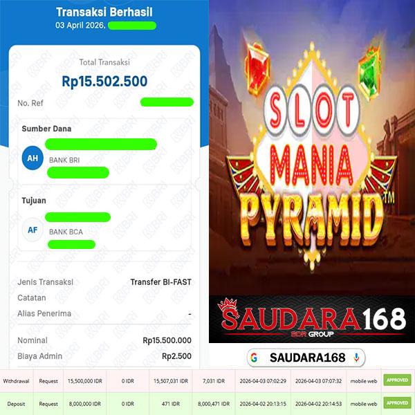 Selamat kepada User id : Sandxxxx Telah berhasil mendapatkan kemenangan besar pada permainan SLOT SLOT MANIA PYRAMID kemenangan Sebesar Rp.15.500.000, Setelah mengisi formulir withdraw dengan kurung waktu hanya 5 – 10 menit pihak Saudara168 sudah melakukan transfer kepada pemilik User id dan dana sudah dapat di cairkan oleh pemenang. Bukti pembayaran yang kami berikan merupakan bukti pembayaran yang SAH / VALID yang langsung di dapatkan melalui tanda transfer transaksi dari Bank yang di tuju.