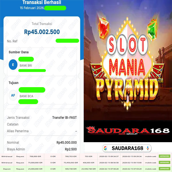 SAUDARA168 Bukti Kemenangan Slot Di Game SLOT MANIA PYRAMID Rp.75.768.000.,- Lunas.