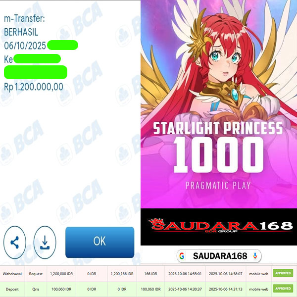 Selamat kepada User id : Tanaxxxx Telah berhasil mendapatkan kemenangan besar pada permainan SLOT STARLIGHT PRINCES 1000 kemenangan Sebesar Rp.1.200.000, Setelah mengisi formulir withdraw dengan kurung waktu hanya 5 – 10 menit pihak Saudara168 sudah melakukan transfer kepada pemilik User id dan dana sudah dapat di cairkan oleh pemenang. Bukti pembayaran yang kami berikan merupakan bukti pembayaran yang SAH / VALID yang langsung di dapatkan melalui tanda transfer transaksi dari Bank yang di tuju.