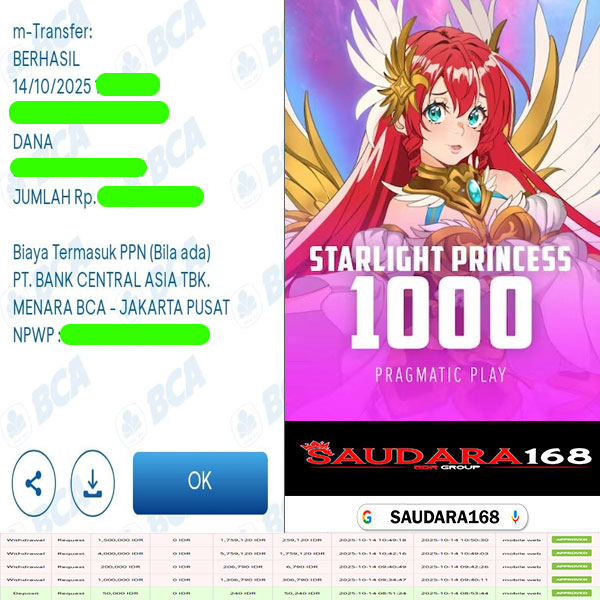 Selamat kepada User id : Borjxxxx Telah berhasil mendapatkan kemenangan besar pada permainan SLOT STARLIGHT PRINCES 1000 kemenangan Sebesar Rp.6.700.000, Setelah mengisi formulir withdraw dengan kurung waktu hanya 5 – 10 menit pihak Saudara168 sudah melakukan transfer kepada pemilik User id dan dana sudah dapat di cairkan oleh pemenang. Bukti pembayaran yang kami berikan merupakan bukti pembayaran yang SAH / VALID yang langsung di dapatkan melalui tanda transfer transaksi dari Bank yang di tuju.