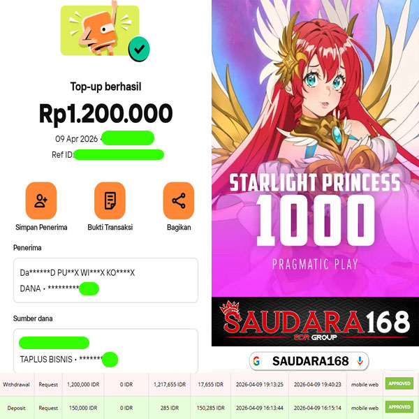 Selamat kepada User id : Putuxxxx Telah berhasil mendapatkan kemenangan besar pada permainan SLOT STARLIGHT PRINCESS 1000 kemenangan Sebesar Rp.1.200.000, Setelah mengisi formulir withdraw dengan kurung waktu hanya 5 – 10 menit pihak Saudara168 sudah melakukan transfer kepada pemilik User id dan dana sudah dapat di cairkan oleh pemenang. Bukti pembayaran yang kami berikan merupakan bukti pembayaran yang SAH / VALID yang langsung di dapatkan melalui tanda transfer transaksi dari Bank yang di tuju.