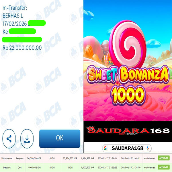Selamat kepada User id : Tikuxxxx Telah berhasil mendapatkan kemenangan besar pada permainan SLOT SWEET BONANZA 1000 kemenangan Sebesar Rp.26.000.000, Setelah mengisi formulir withdraw dengan kurung waktu hanya 5 – 10 menit pihak Saudara168 sudah melakukan transfer kepada pemilik User id dan dana sudah dapat di cairkan oleh pemenang. Bukti pembayaran yang kami berikan merupakan bukti pembayaran yang SAH / VALID yang langsung di dapatkan melalui tanda transfer transaksi dari Bank yang di tuju.