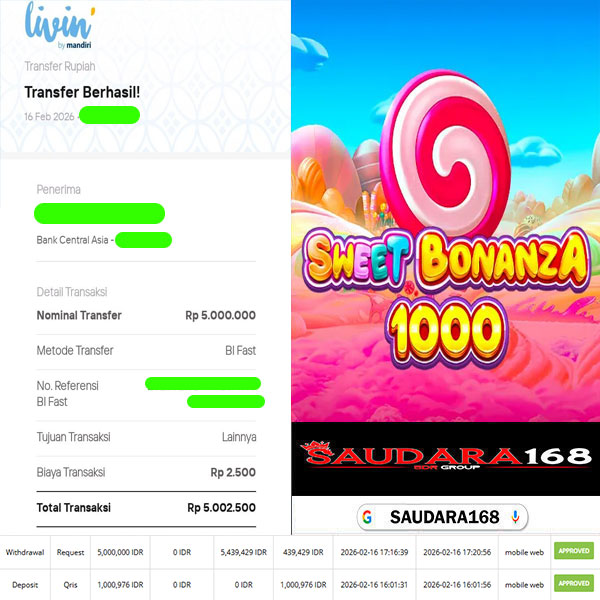 Selamat kepada User id : Tikuxxxx Telah berhasil mendapatkan kemenangan besar pada permainan SLOT SWEET BONANZA 1000 kemenangan Sebesar Rp.5.000.000, Setelah mengisi formulir withdraw dengan kurung waktu hanya 5 – 10 menit pihak Saudara168 sudah melakukan transfer kepada pemilik User id dan dana sudah dapat di cairkan oleh pemenang. Bukti pembayaran yang kami berikan merupakan bukti pembayaran yang SAH / VALID yang langsung di dapatkan melalui tanda transfer transaksi dari Bank yang di tuju.
