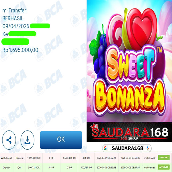 Selamat kepada User id : Novixxxx Telah berhasil mendapatkan kemenangan besar pada permainan SLOT SWEET BONANZA kemenangan Sebesar Rp.1.695.000, Setelah mengisi formulir withdraw dengan kurung waktu hanya 5 – 10 menit pihak Saudara168 sudah melakukan transfer kepada pemilik User id dan dana sudah dapat di cairkan oleh pemenang. Bukti pembayaran yang kami berikan merupakan bukti pembayaran yang SAH / VALID yang langsung di dapatkan melalui tanda transfer transaksi dari Bank yang di tuju.