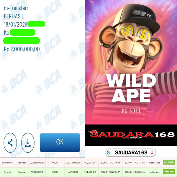 Selamat kepada User id : Binexxxx Telah berhasil mendapatkan kemenangan besar pada permainan SLOT WILD APE kemenangan Sebesar Rp.2.000.000, Setelah mengisi formulir withdraw dengan kurung waktu hanya 5 – 10 menit pihak Saudara168 sudah melakukan transfer kepada pemilik User id dan dana sudah dapat di cairkan oleh pemenang. Bukti pembayaran yang kami berikan merupakan bukti pembayaran yang SAH / VALID yang langsung di dapatkan melalui tanda transfer transaksi dari Bank yang di tuju.
