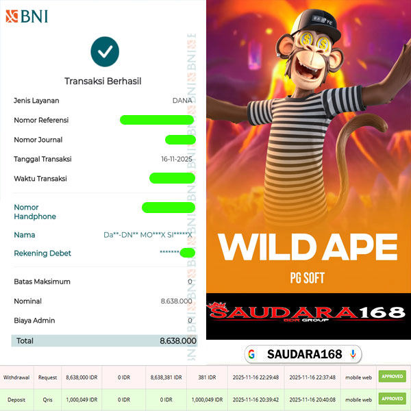 Selamat kepada User id : Nikixxxx Telah berhasil mendapatkan kemenangan besar pada permainan SLOT WILD APE kemenangan Sebesar Rp.8.638.000, Setelah mengisi formulir withdraw dengan kurung waktu hanya 5 – 10 menit pihak Saudara168 sudah melakukan transfer kepada pemilik User id dan dana sudah dapat di cairkan oleh pemenang. Bukti pembayaran yang kami berikan merupakan bukti pembayaran yang SAH / VALID yang langsung di dapatkan melalui tanda transfer transaksi dari Bank yang di tuju.