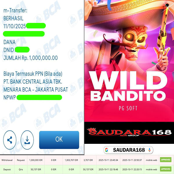 Selamat kepada User id : Karlxxxx Telah berhasil mendapatkan kemenangan besar pada permainan SLOT WILD BANDITO kemenangan Sebesar Rp.1.000.000, Setelah mengisi formulir withdraw dengan kurung waktu hanya 5 – 10 menit pihak Saudara168 sudah melakukan transfer kepada pemilik User id dan dana sudah dapat di cairkan oleh pemenang. Bukti pembayaran yang kami berikan merupakan bukti pembayaran yang SAH / VALID yang langsung di dapatkan melalui tanda transfer transaksi dari Bank yang di tuju.