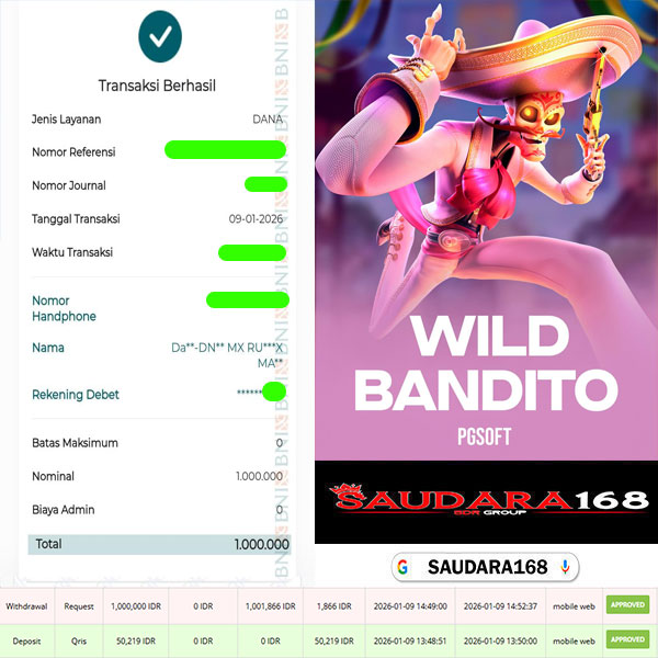 Selamat kepada User id : Rustxxxx Telah berhasil mendapatkan kemenangan besar pada permainan SLOT WILD BANDITO kemenangan Sebesar Rp.1.000.000, Setelah mengisi formulir withdraw dengan kurung waktu hanya 5 – 10 menit pihak Saudara168 sudah melakukan transfer kepada pemilik User id dan dana sudah dapat di cairkan oleh pemenang. Bukti pembayaran yang kami berikan merupakan bukti pembayaran yang SAH / VALID yang langsung di dapatkan melalui tanda transfer transaksi dari Bank yang di tuju.