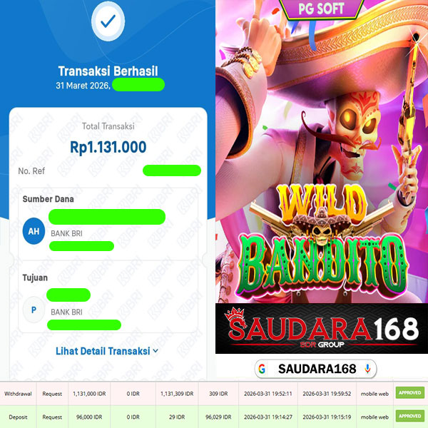 Selamat kepada User id : Harixxxx Telah berhasil mendapatkan kemenangan besar pada permainan SLOT WILD BANDITO kemenangan Sebesar Rp.1.131.000, Setelah mengisi formulir withdraw dengan kurung waktu hanya 5 – 10 menit pihak Saudara168 sudah melakukan transfer kepada pemilik User id dan dana sudah dapat di cairkan oleh pemenang. Bukti pembayaran yang kami berikan merupakan bukti pembayaran yang SAH / VALID yang langsung di dapatkan melalui tanda transfer transaksi dari Bank yang di tuju.