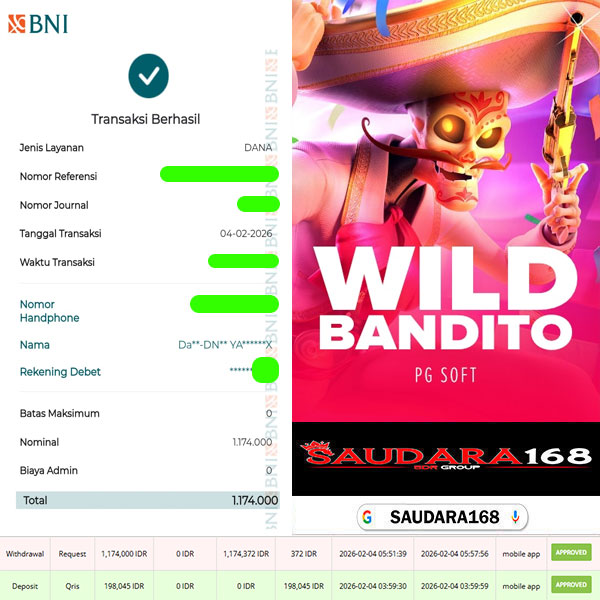 Selamat kepada User id : Asdfxxxx Telah berhasil mendapatkan kemenangan besar pada permainan SLOT WILD BANDITO kemenangan Sebesar Rp.1.174.000, Setelah mengisi formulir withdraw dengan kurung waktu hanya 5 – 10 menit pihak Saudara168 sudah melakukan transfer kepada pemilik User id dan dana sudah dapat di cairkan oleh pemenang. Bukti pembayaran yang kami berikan merupakan bukti pembayaran yang SAH / VALID yang langsung di dapatkan melalui tanda transfer transaksi dari Bank yang di tuju.