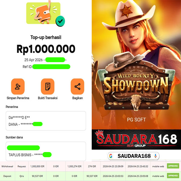 Selamat kepada User id : Renaxxxx Telah berhasil mendapatkan kemenangan besar pada permainan SLOT WILD BOUNTY SHOWDOWN kemenangan Sebesar Rp.1.000.000, Setelah mengisi formulir withdraw dengan kurung waktu hanya 5 – 10 menit pihak Saudara168 sudah melakukan transfer kepada pemilik User id dan dana sudah dapat di cairkan oleh pemenang. Bukti pembayaran yang kami berikan merupakan bukti pembayaran yang SAH / VALID yang langsung di dapatkan melalui tanda transfer transaksi dari Bank yang di tuju.