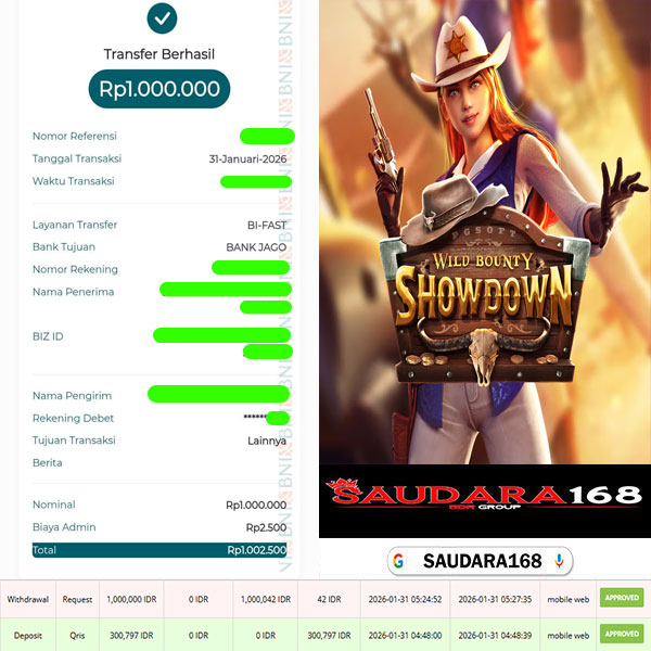 Selamat kepada User id : Johnxxxx Telah berhasil mendapatkan kemenangan besar pada permainan SLOT WILD BOUNTY SHOWDOWN kemenangan Sebesar Rp.1.000.000, Setelah mengisi formulir withdraw dengan kurung waktu hanya 5 – 10 menit pihak Saudara168 sudah melakukan transfer kepada pemilik User id dan dana sudah dapat di cairkan oleh pemenang. Bukti pembayaran yang kami berikan merupakan bukti pembayaran yang SAH / VALID yang langsung di dapatkan melalui tanda transfer transaksi dari Bank yang di tuju.
