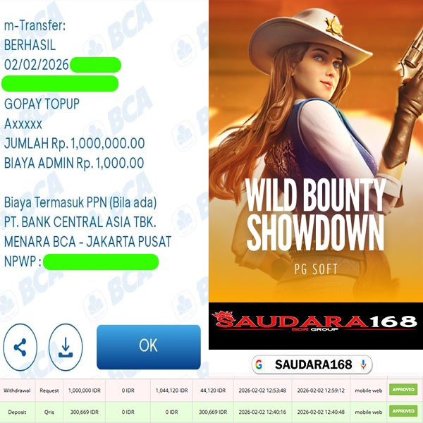 Selamat kepada User id : Max0xxxx Telah berhasil mendapatkan kemenangan besar pada permainan SLOT WILD BOUNTY SHOWDOWN kemenangan Sebesar Rp.1.000.000, Setelah mengisi formulir withdraw dengan kurung waktu hanya 5 – 10 menit pihak Saudara168 sudah melakukan transfer kepada pemilik User id dan dana sudah dapat di cairkan oleh pemenang. Bukti pembayaran yang kami berikan merupakan bukti pembayaran yang SAH / VALID yang langsung di dapatkan melalui tanda transfer transaksi dari Bank yang di tuju.
