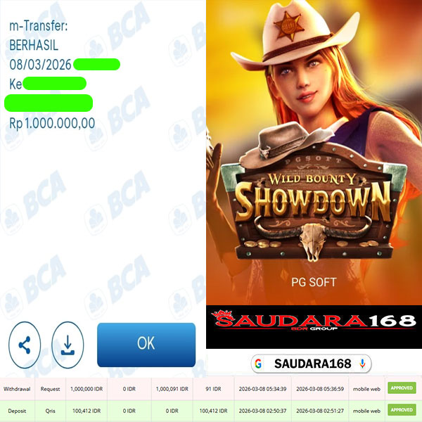 Selamat kepada User id : Ekipxxxx Telah berhasil mendapatkan kemenangan besar pada permainan SLOT WILD BOUNTY SHOWDOWN kemenangan Sebesar Rp.1.000.000, Setelah mengisi formulir withdraw dengan kurung waktu hanya 5 – 10 menit pihak Saudara168 sudah melakukan transfer kepada pemilik User id dan dana sudah dapat di cairkan oleh pemenang. Bukti pembayaran yang kami berikan merupakan bukti pembayaran yang SAH / VALID yang langsung di dapatkan melalui tanda transfer transaksi dari Bank yang di tuju.