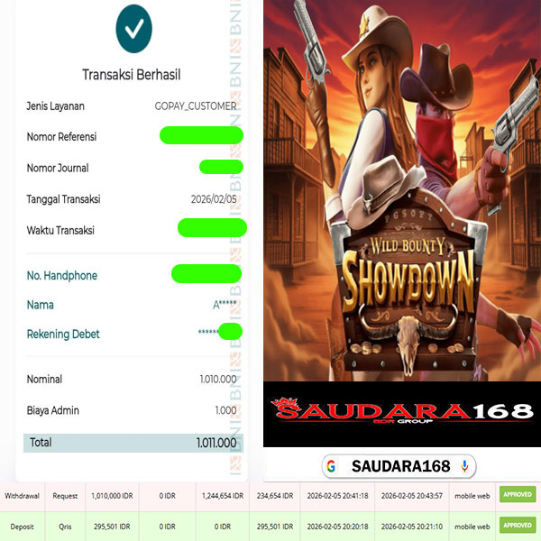 Selamat kepada User id : Max0xxxx Telah berhasil mendapatkan kemenangan besar pada permainan SLOT WILD BOUNTY SHOWDOWN kemenangan Sebesar Rp.1.010.000, Setelah mengisi formulir withdraw dengan kurung waktu hanya 5 – 10 menit pihak Saudara168 sudah melakukan transfer kepada pemilik User id dan dana sudah dapat di cairkan oleh pemenang. Bukti pembayaran yang kami berikan merupakan bukti pembayaran yang SAH / VALID yang langsung di dapatkan melalui tanda transfer transaksi dari Bank yang di tuju.