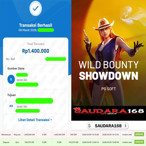 Selamat kepada User id : Romexxxx Telah berhasil mendapatkan kemenangan besar pada permainan SLOT WILD BOUNTY SHOWDOWN kemenangan Sebesar Rp.1.400.000, Setelah mengisi formulir withdraw dengan kurung waktu hanya 5 – 10 menit pihak Saudara168 sudah melakukan transfer kepada pemilik User id dan dana sudah dapat di cairkan oleh pemenang. Bukti pembayaran yang kami berikan merupakan bukti pembayaran yang SAH / VALID yang langsung di dapatkan melalui tanda transfer transaksi dari Bank yang di tuju.