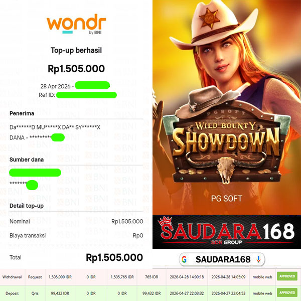 Selamat kepada User id : Syahxxxx Telah berhasil mendapatkan kemenangan besar pada permainan SLOT WILD BOUNTY SHOWDOWN kemenangan Sebesar Rp.1.505.000, Setelah mengisi formulir withdraw dengan kurung waktu hanya 5 – 10 menit pihak Saudara168 sudah melakukan transfer kepada pemilik User id dan dana sudah dapat di cairkan oleh pemenang. Bukti pembayaran yang kami berikan merupakan bukti pembayaran yang SAH / VALID yang langsung di dapatkan melalui tanda transfer transaksi dari Bank yang di tuju.