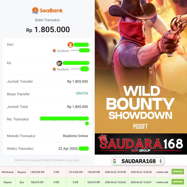 Selamat kepada User id : Ikehxxxx Telah berhasil mendapatkan kemenangan besar pada permainan SLOT WILD BOUNTY SHOWDOWN kemenangan Sebesar Rp.1.805.000, Setelah mengisi formulir withdraw dengan kurung waktu hanya 5 – 10 menit pihak Saudara168 sudah melakukan transfer kepada pemilik User id dan dana sudah dapat di cairkan oleh pemenang. Bukti pembayaran yang kami berikan merupakan bukti pembayaran yang SAH / VALID yang langsung di dapatkan melalui tanda transfer transaksi dari Bank yang di tuju.