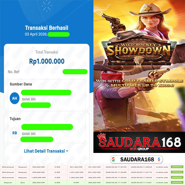 Selamat kepada User id : Husexxxx Telah berhasil mendapatkan kemenangan besar pada permainan SLOT WILD BOUNTY SHOWDOWN kemenangan Sebesar Rp.2.000.000, Setelah mengisi formulir withdraw dengan kurung waktu hanya 5 – 10 menit pihak Saudara168 sudah melakukan transfer kepada pemilik User id dan dana sudah dapat di cairkan oleh pemenang. Bukti pembayaran yang kami berikan merupakan bukti pembayaran yang SAH / VALID yang langsung di dapatkan melalui tanda transfer transaksi dari Bank yang di tuju.