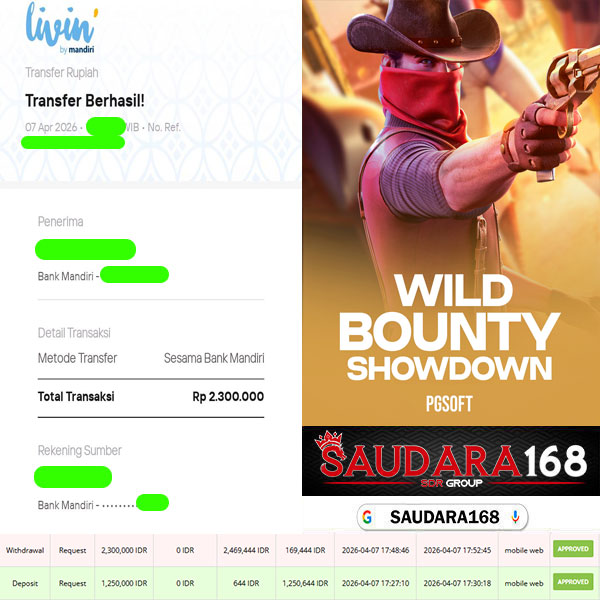 Selamat kepada User id : Hepixxxx Telah berhasil mendapatkan kemenangan besar pada permainan SLOT WILD BOUNTY SHOWDOWN kemenangan Sebesar Rp.2.300.000, Setelah mengisi formulir withdraw dengan kurung waktu hanya 5 – 10 menit pihak Saudara168 sudah melakukan transfer kepada pemilik User id dan dana sudah dapat di cairkan oleh pemenang. Bukti pembayaran yang kami berikan merupakan bukti pembayaran yang SAH / VALID yang langsung di dapatkan melalui tanda transfer transaksi dari Bank yang di tuju.
