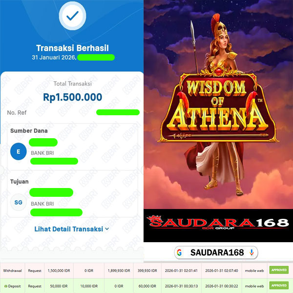 Selamat kepada User id : Yantxxxx Telah berhasil mendapatkan kemenangan besar pada permainan SLOT WISDOM OF ATHENA kemenangan Sebesar Rp.1.500.000, Setelah mengisi formulir withdraw dengan kurung waktu hanya 5 – 10 menit pihak Saudara168 sudah melakukan transfer kepada pemilik User id dan dana sudah dapat di cairkan oleh pemenang. Bukti pembayaran yang kami berikan merupakan bukti pembayaran yang SAH / VALID yang langsung di dapatkan melalui tanda transfer transaksi dari Bank yang di tuju.